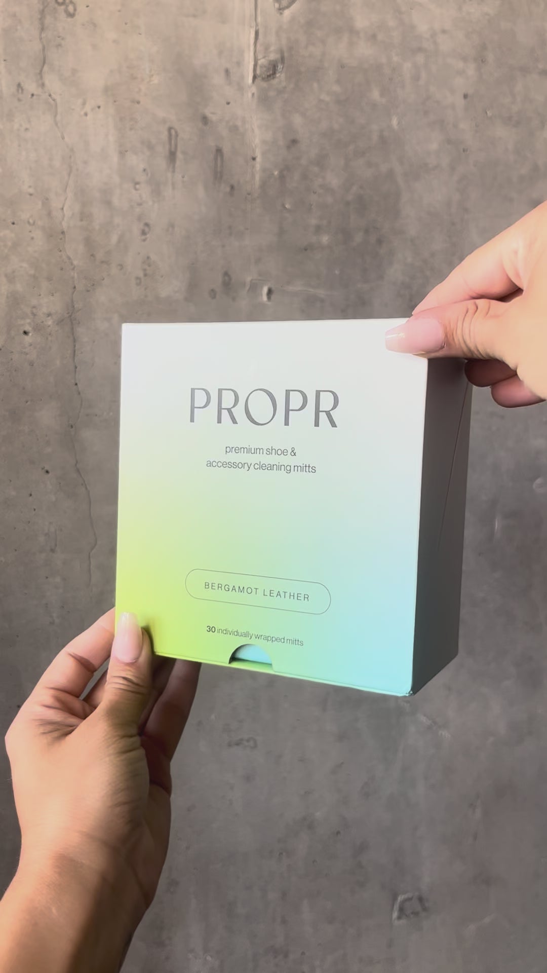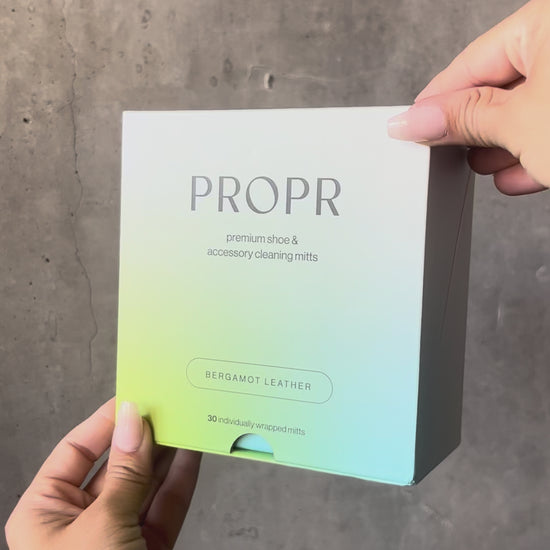 Meet the fuss-free alternative to sprays, wipes, and messy handbag and shoe cleaning kits. PROPR Cleaning Mitts are pre-moistened, petal-shaped cloths, powered by a gentle, effective, plant-based formula designed to reach every seam, stitch, crease, and corner of your shoes and accessories. Safe for leather, canvas, and rubber, these mitts revive your items in seconds without harsh chemicals.